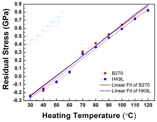 The results of the residual stress versus heating temperature show that VO2 thin films coated on the HK9L and B270 glass substrates exhibit compressive stress after coating. As the temperature increases from 60 to 100 °C, the compressive stress gradually moves toward the tensile stress state. Figure 7 shows the linear fitting diagram of the residual stress vs. heating temperature for the VO2 films coated on the B270 and H-K9L glass substrates.