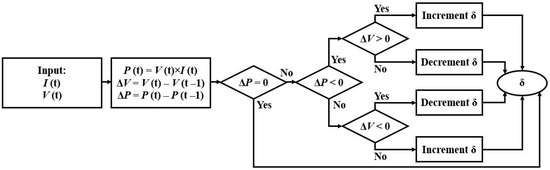 A visual representation of the flowchart outlining the P&O method is given in Figure 3. It involves systematically perturbing the array voltage, either by increasing or decreasing it, and monitoring the resulting output power. In the event of a power increase, the perturbation continues in the same direction; otherwise, it reverses direction.