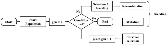 This iterative process continues until a predefined stopping condition is met. The stopping condition is often based on achieving a desired fitness level for the solutions [15,16]. The repetition continues until the specified condition, an expected fitness level or a maximum number of iterations, is satisfied.