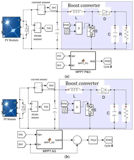 The power converter and the tracking algorithm are primarily linked through the duty cycle (δ). The tracking algorithm assesses voltage and current data from the system, dynamically adjusting the duty cycle to optimize extracted power [26]. Figure 5 depicts the boost converter models utilized for the P&O and GA tracking algorithms. In both cases, the dimensioned boost converter maintains consistent values, with inductance and capacitance data determined by Equations (1) and (2). Simultaneously, duty cycle determination is executed through Equation (3), thereby isolating the δ parameter. All simulations for both algorithms are conducted within the Matlab/Simulink computing environment.