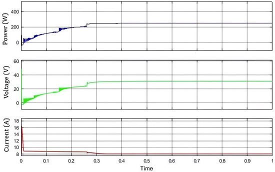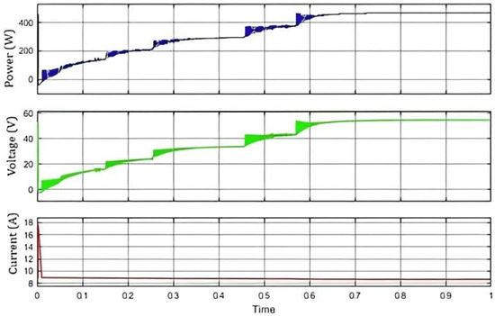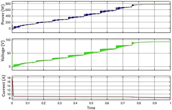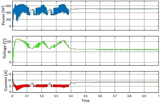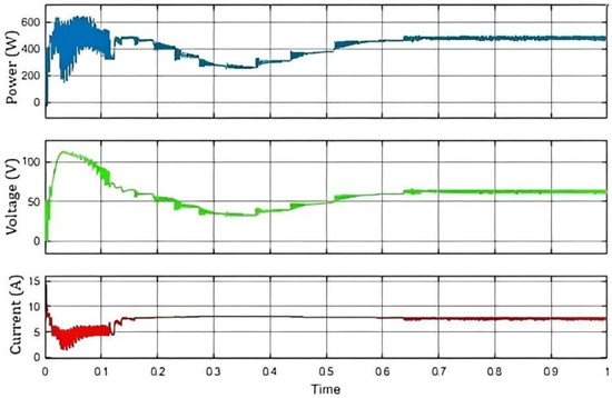 When partial shading is not applied, and the maximum power point is determined to be 778.19 W, both techniques demonstrate satisfactory performance under steady-state conditions. Figure 6 and Figure 7 depict the power, voltage, and current plots corresponding to the P&O and GA-based MPPT techniques, respectively.