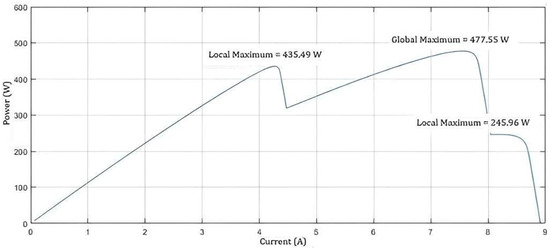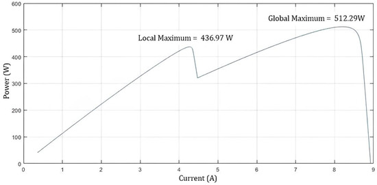 Figure 8 offers a comprehensive insight into the photovoltaic arrangement’s P-I curve under partial shading conditions. The intricate curve presents two noteworthy maximum points, contributing to the nuanced system performance analysis. Notably, a local maximum lies at 436.97 W, while a global maximum is at 512.29 W.