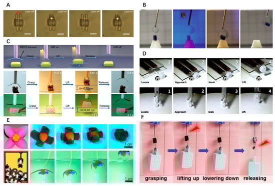 A two-armed type of hydrogel microcantilever is shown in Figure 8A. The actuator can respond quickly in water under near-infrared light and is capable of repeated deformation. The distance between the two arms of the driver can be controlled by controlling the focus laser and the power of the laser [41]. Figure 8B shows a simple gripper made using light-driven materials. The bending of the gripper can be realized under the action of light, and the gripper can grip objects larger than its weight [52]. Figure 8C also shows a double-arm actuator made of light-driven material. The actuator grips objects by light drive, has a fast response time, and has an adhesive force on the object when gripping it. The figure shows a double-arm drive to clamp different objects, driven in near-infrared light [48]. Figure 8D represents a single-arm actuator and a two-arm actuator gripping an object. Above that is a single-arm actuator, in the state of current off, the actuator remains straight; under the action of current, the single-arm actuator can achieve bending and hooking objects. Below the picture is a double arm actuator, in the absence of current, the actuator remains straight; under the action of current, the double arms bend inward to clamp the object and achieve movement of the object [75]. Figure 8E shows a cross-shaped manipulator made of hydrogel. The manipulator can bend in the water to achieve the wrapping of objects. The temperature of the water can be controlled to achieve the grasp and release of objects, and these deformations can be cycled many times [20]. Figure 8F shows a Y-shaped gripper made using smart materials. The Y-shaped grip consists of an arm and two fingers. The near-infrared light drive enables the actions of grasping, raising, and lowering objects. The actuator is capable of grasping objects 150 times its size [104].