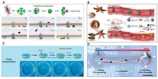 Microrobots made of smart materials can roll and crawl in response to environmental stimuli. Some animals use rolling and crawling to move forward, such as millipedes, which crawl through their several feet. Figure 9A shows a fabricated sheet structure crawling microrobot. The microrobot can creep and crawl under the action of near-infrared light, and the robot can move forward by controlling the switch of light [105]. An electrically driven actuator can be formed using a double layer of liquid crystal elastomer and carbon black. Joule heating of the carbon black can create uneven stresses in the actuator, causing the actuator to roll forward. Figure 9B shows a cylindrical electric driver made from liquid crystal elastomer and carbon black. Under the action of the current, the drive rolls forward by turning into an approximately vertical ellipse, the current is turned off, and the drive stops moving [78]. Figure 9C shows a cylinder-type robot made with several blades according to certain rules. The ends of this microrobot can be bent by the action of light. The microrobots are deformed by shining light on certain areas. Rational planning of deformation positions allows the microrobot to advance sequentially [43]. Figure 9D shows a cone with several magnetic responses on a piece of sheet material. The cone is slightly deformed by the action of the magnetic field so that the whole advances. The microrobot can move forward on a flat surface, can carry a certain weight of objects forward, and can also climb over surfaces with gullies [106].