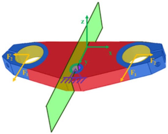 Symmetry in the YZ plane: While forces are symmetrical with respect to this plane, ensuring symmetric results is essential for consistent behaviour and stiffness across both sides of the front fork. This plane is represented in green in