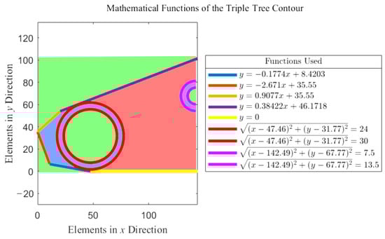 Mathematical functions of the triple tree contour. The functions are written in the legend “Functions Used”. In shaded green, the void space is represented and in shaded red, the design space; and in shaded blue, the non-design space is represented.
