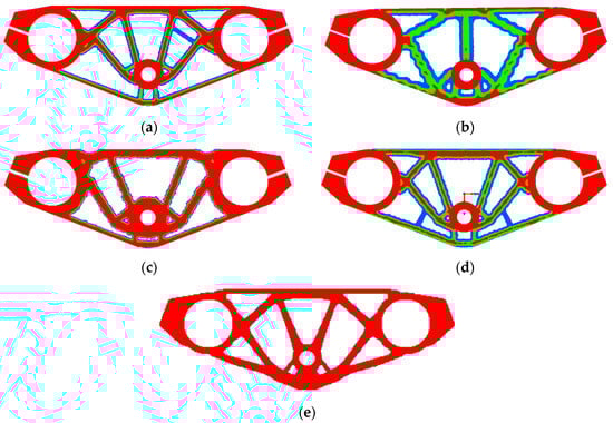 Results of the topology optimization process with the software packages and the MATLAB implementations. Coloured in blue, elements with a density over 0.1 are represented; in green, elements with a density over 0.5; and in red, elements with a density over 0.9. (a) HyperMesh 2023.1, (b) CREO Parametric 6.0.1.0., (c) SolidWroks 2023, (d) ANSYS Workbench 2023 R1, and (e) MATLAB.
