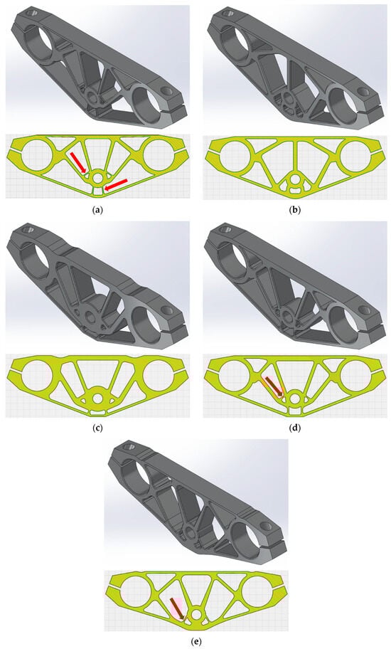 CAD interpretations and manufacturing analysis through Ultimaker Cura analysis of every optimization result. (a) HyperMesh 2023.1 CAD, (b) CREO Parametric 6.0.1.0, (c) SolidWorks 2023, (d) ANSYS Workbench 2023 R1, and (e) MATLAB. The critical features for checking the minimum length constraint are indicated using red arrows.