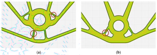 Detail of the critical features for the minimum length constraint. (a) HyperMesh 2023.1 result. (b) MATLAB implementation result. The zones where the minimum length constraint is activated and only six solid perimetral layers are computed are highlighted with red circles.