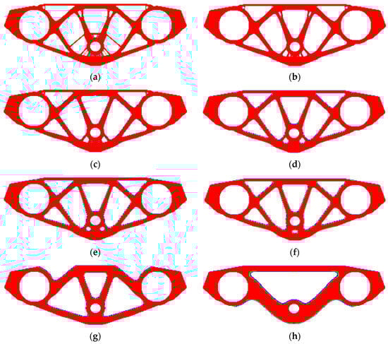 Results of the case study for different filter radii. Elements with a density over 0.1 are coloured in blue; in green, elements with a density over 0.5; and in red, elements with a density over 0.9. (a) R = 1.2 mm. (b) R = 1.6 mm. (c) R = 2.4 mm. (d) R = 3 mm. (e) R = 4 mm. (f) R = 4 mm. (g) R = 8 mm. (h) R = 12 mm.