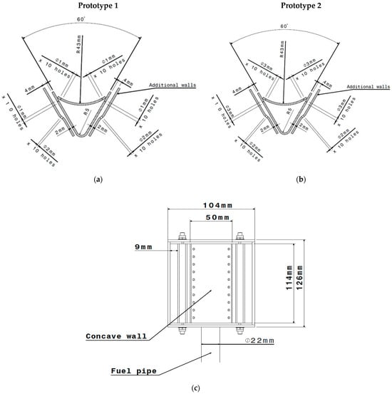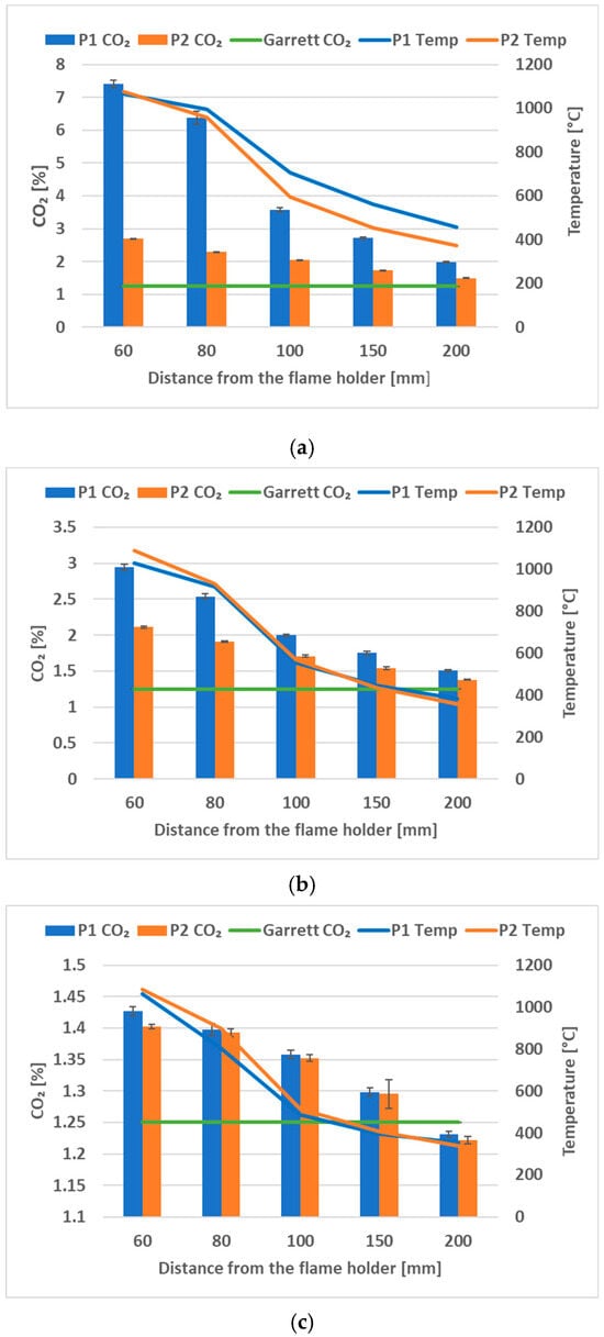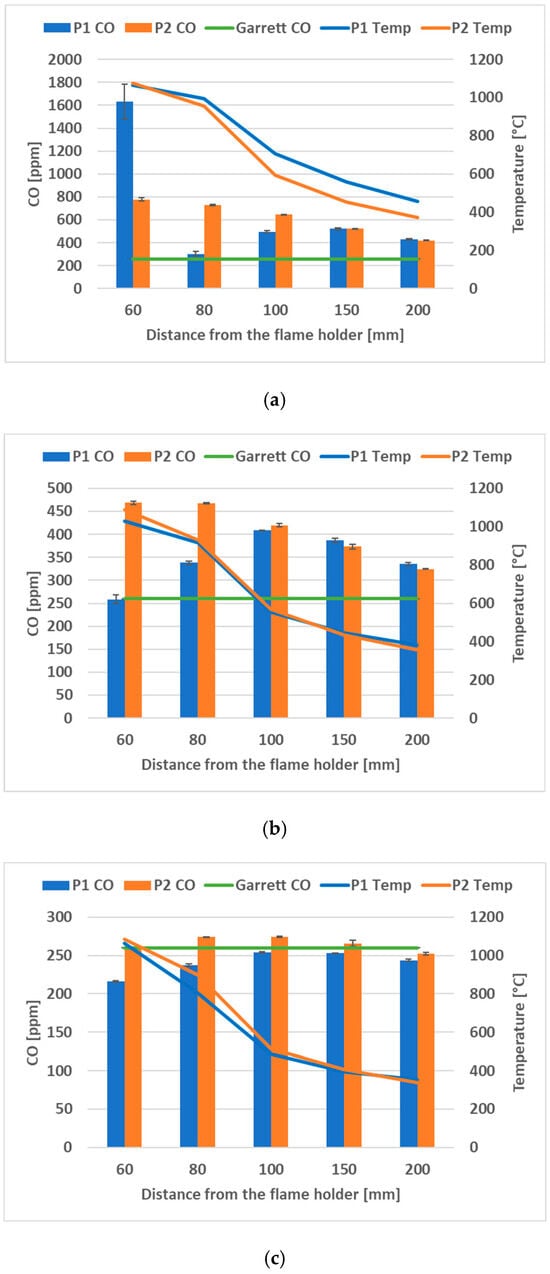 - The CO levels decreased as the percentage of H2 in the fuel increased. For the P1 prototype, the maximum value was only at the first measurement point, at a distance of 60 mm from the flame holder, in the case of using 60% H2 in the fuel mixture. The rest of the measurements indicate that the P2 prototype geometry obtains better behavior in terms of CO emissions.