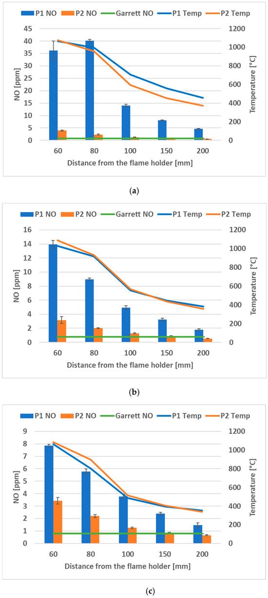 - The NO emissions gradually decreased as the percentage of H2 in the fuel mixture increased. The NO concentration was significantly lower in the case of prototype P2 in comparison with prototype P1 for all the measurement points at all of the hydrogen concentrations in the fuel mixture.