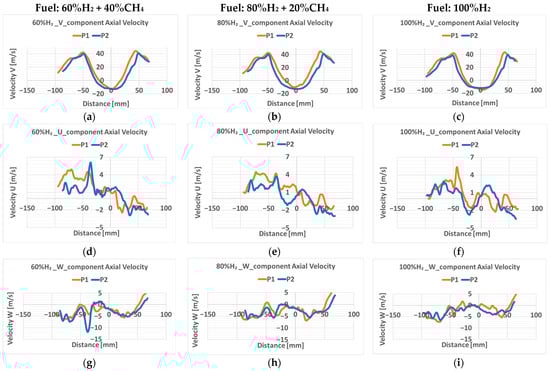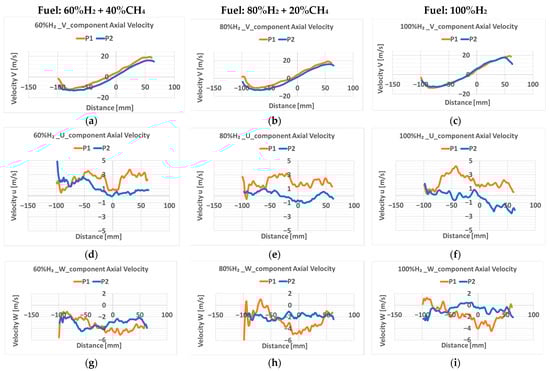 - Increasing the V-gutter bluff body expansion angle extends the flame stability limits. The shortest recirculation zone was observed for P1, where the axial velocity reaches a negative peak of approximately 12 m/s at roughly 50 mm downstream of the edge of the flame holder, and the recirculation region spans about 90 mm. In comparison, the P2 prototype has a length of the recirculation region span of about 100 mm with a negative peak of approximately 14 m/s. The transversal velocity (U) components are minimal for both prototypes, reflecting the dominance of axial flow along the centerline. The slight fluctuations can be attributed to external wind currents in the experimental setup. The spanwise velocity (W) components exhibit small values for both prototypes. The data spread indicates variability, which is expected due to the calculation-based measurement method of PIV for spanwise velocities. Despite their similar design, P2 consistently performs better across all measured velocity components. This improvement can be attributed to the increased fuel injection holes, which enhance fuel–air mixing and combustion stability. Additionally, the presence of side walls directing the flow around the flame stabilizer further aids in maintaining a stable combustion process. The influence of ambient conditions, such as wind currents, is minimal but noticeable in the transversal velocity measurements. The spanwise velocity, calculated rather than directly measured, shows more variability but supports the conclusion that P2 and higher hydrogen concentrations result in improved flow characteristics.