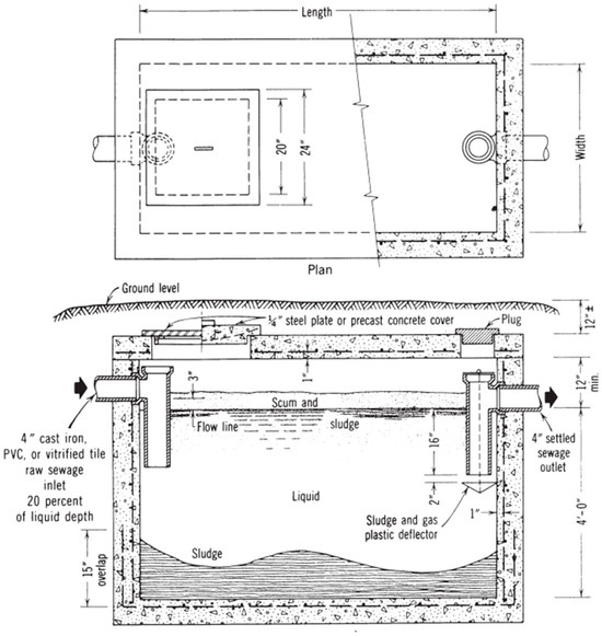 Donald Cameron’s basic septic tank design has evolved significantly, with improvements driven by environmental research and new material technologies. Current septic systems may utilise durable materials [36,37] such as fibreglass, polyethene, and precast reinforced concrete to overcome the limitations of earlier designs, such as corrosion in metal tanks. Modern septic tanks are engineered for optimal performance, including specific requirements for detention times, surface area-to-depth ratios, and multi-chamber configurations to enhance the treatment process (Figure 2 and Figure 3) [38,39]. These tanks primarily operate through anaerobic digestion, where microorganisms break down waste into sludge and scum. Some designs may sometimes incorporate aerobic processes to hasten digestion when external oxygen is introduced, although this is less common due to the higher costs associated with oxygenation systems. Figure 2 and Figure 3 depict septic tank designs built using good-quality reinforced concrete, as recommended in reference [36], and a simple diagram of a two-chamber septic tank, respectively.