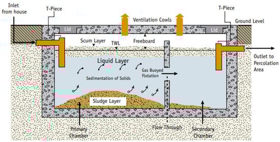 A significant breakthrough came in the 1860s with L.H. Mouras’s invention of the ‘fosses Mouras’, a cesspit system with inlet and outlet pipes that extended below the water surface to create a seal, preventing odours from escaping. Building upon these advancements, Donald Cameron introduced the modern septic tank system (Figure 1) in 1895 [3], which was designed for efficient, sludge-free sewage liquefaction and purification using an anaerobic process [35]. His design used airtight, cement–concrete tanks that facilitated anaerobic digestion, breaking down waste without the presence of air or light so that all solid organic matter it contained was liquefied. Subsequently, only liquid effluent was discharged into the environment.