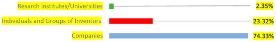 The categorisation of patent filers referred to as applicant profiles is pivotal for understanding the driving forces behind patent activities. To simplify the analysis, applicant profiles were segmented into three primary categories: companies, individuals and groups of inventors, and research institutes and universities. The classification of each patent was based on the ‘optimised assignee’ field in the patent documentation, which indicated the primary entity responsible for the patent and reflected the underlying corporate or organisational structure. In instances where a patent listed more than one optimised assignee, it was categorised under all applicable profiles to accurately reflect shared interests or collaborative efforts.