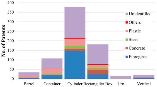 In the structure-based search categories of this study, a variety of septic tank shapes and materials were identified and recorded as the review of patents progressed. The analysis revealed six main shapes commonly used in septic tank design: cylinders, rectangular boxes, containers, barrels, vertical shapes, and urns. Figure 10 illustrates the proportion of patents categorised by different septic tank shapes and further details the materials used in their construction. It provides a visual breakdown of the most commonly used shapes—cylinders, rectangular boxes, containers, barrels, vertical shapes, and urns—and correlates these with materials such as fibreglass, plastic, concrete, and others. This visualisation helps in understanding the trends in material preferences and design choices within the septic tank industry, showcasing how different materials are favoured for specific tank configurations.