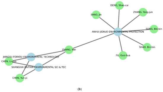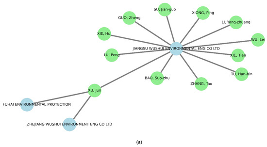 In 2017, inventor Xu Jun filed a patent under Fuhai Environmental Protection [56], marking the beginning of a series of innovations in high-efficiency, high-resistance, glass fiber-reinforced plastic septic tanks. Subsequent collaborations saw Xu Jun partnering with Jiangsu Wushui Environmental Engineering Co., Ltd. [57] and Zhejiang Wushui Environment Eng Co., Ltd. [58] in 2018 and 2020, respectively, leading to further advancements in this technology. Similarly, Jiangsu Wushui Environmental Eng Co., Ltd. expanded its patent portfolio, with four additional patents on similar technologies, developed by a team including Xie Tian, Xie Hui, and others, illustrating a concentrated effort in this area [59,60,61]. This network of collaborations is shown in Figure 11a.