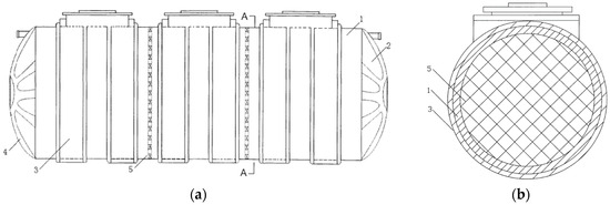 - Li, J.; Wang, W.; Yin, S.; Jiang, N.; Xiang, Z.; Sun, L. Multi-Grid Septic Tank of Concrete Pipe. CN217351134U, 10 May 2022. [Google Scholar]