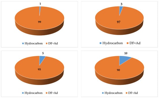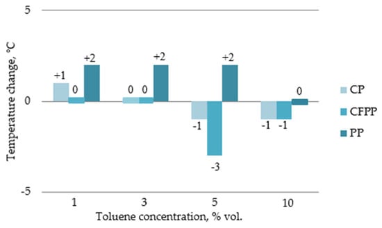 Figure 3 shows that toluene addition to the DF sample/depressant mixture has no noticeable effect on the CP (changes of −1 to +1 °C). There is a slight decrease in the additive’s effectiveness in relation to the PP (PP increases by 0–2 °C). However, the addition of toluene has a slight positive influence on the CFPP (CFPP decreases by 1–3 °C). The addition of 5% vol. to the DF sample/depressant mixture reduces the CFPP to −5 °C and allows it to produce a summer brand DF as required by [].