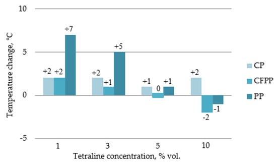 Figure 4 shows that the addition of tetralin to the DF sample/depressant mixture reduces the additive’s effectiveness in almost all cases. The greatest negative effect (increase by 7 °C) is observed in relation to the PP when 1% vol. of tetralin is added. However, the amount of tetralin in the mixture increased to 10% vol. leveled the negative effect, which is due to the good low-temperature properties of the tetralin itself (PP is −36 °C).