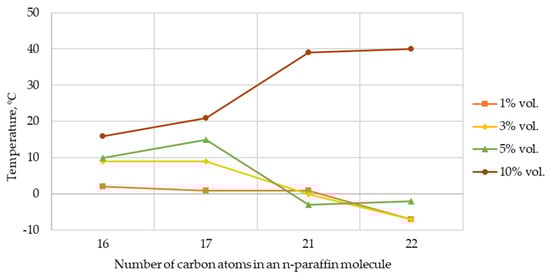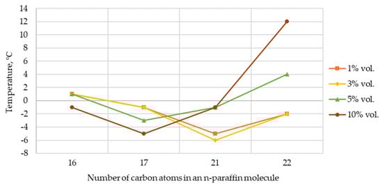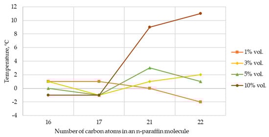 The differences in the low-temperature properties of the DF sample/depressant mixtures with the addition of different concentrations of n-paraffinic hydrocarbons depending on the number of carbon atoms are shown in Figure 5, Figure 6 and Figure 7.