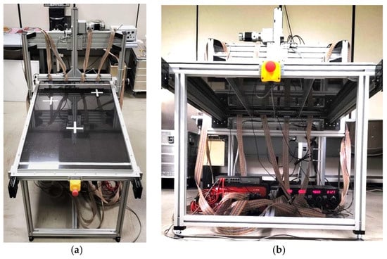 The system features a thin and robust table made of a carbon fiber plate, supported by an aluminum frame and reinforced from below by three additional thin aluminum beams, on which the radwaste under investigation has to be placed. The overall dimensions of the PI3SO prototype tabletop are 120 × 80 cm2. In order to cover the whole effective area with 1 cm2 cross-section detectors, one would need several thousand elements, which would be overly expensive and unrealistic. Indeed, this solution might sound effective but it would require unsustainable costs for the detectors and the electronics, as well as complex procedures for maintenance and handling. To overcome this challenge, the implementation of an array of small detectors in a linear geometry, sliding along the table to cover the sensitive area, sounded a more realistic solution. This strategy ensures complete scanning of the sensitive area with a dramatic cost reduction at the price of increasing the scanning time. A mechanical sliding bridge is implemented, which supports two linear arrays of 64 medium energy resolution gamma-ray detectors, each one of 1 × 1 × 1 cm3 size. The two arrays are placed over and beneath the table, with the bridge sliding forward/backward along the horizontal direction to span the length of the table (Figure 1), with an effective scanning area of 108 × 64 cm2.