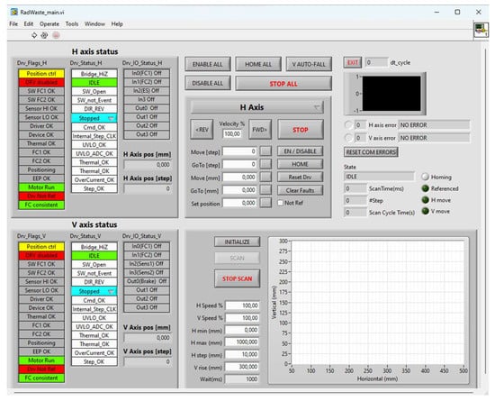 The two detector arrays can be moved to traverse the table surface, acquiring data according to a freely defined stepping scheme. For instance, one can decide to move the bridge in fixed steps (e.g., 10 mm) with a predefined data acquisition time interval or until a predefined minimum number of counts is reached, according to prescribed statistical parameters. Or else one can opt for a slow continuous scan across the full area or part of it. Once a first quick scan is performed, on the basis of the two count rate data images, one can define a region of interest (ROI) and start a longer spectral measurement on a selected area to (try to) identify the gamma emitters. The sliding bridge is also equipped with an optical proximity sensor, which prevents collisions with prominent objects on the table, and the software has the capability of lifting the vertical arm until the possible collision condition is removed and the scan can continue.