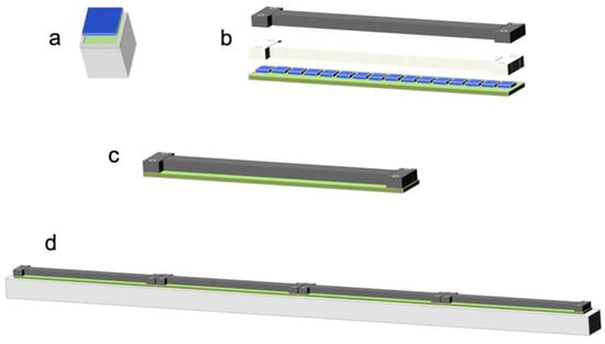 (a) Coupling of an SiPM (blue) with the CsI(Tl) crystal (green) surrounded by the reflective resin case (grey). (b) Exploded view of the electronic board hosting 16 SiPMs, the group of 16 scintillators, and the external light shield. (c) Assembled view of one group. (d) Sketch of one linear array made of four groups fixed on a support rod.