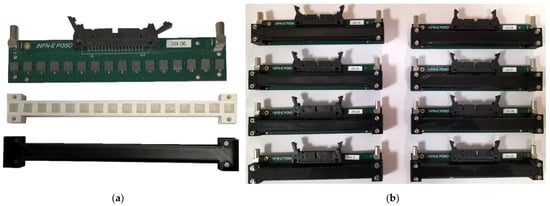 The chosen SiPM was the Multi-Pixel Photon Counter (MPPC) S14160-6050HS produced by Hamamatsu, which has a 6 × 6 mm2 area with 14,331 microcells and basically no dead frame around the active region []. Taking advantage of the SiPM features, along with those of the CsI(Tl) scintillating crystal, a full set of gamma-ray detectors was developed to be arranged in the form of two linear arrays for the scanner. The 128 detectors were assembled into groups of 16 for a total of 8 groups. Each group was encapsulated into a matrix made of white reflective resin. Each scintillator crystal was optically coupled via one of its faces to an SiPM by means of a silicone grease with a refractive index n ≈ 1.5. The SiPM response down to single optical photons allows for optimal sensitivity to gamma radiation, particularly when using small scintillators. In order to prevent external light crossing the white resin and blinding the SiPMs, a cover was 3D-printed in black plastic and lined internally with 200 µm thick black tape. A printed circuit board was designed, which hosts sixteen SiPMs along with their simple polarization and readout networks. The bias voltage, unique for all the SiPMs, can be provided via either one of two connectors placed on the board sides. A central dual-in-line 34-pin connector provides the sixteen output signals. The choice of using a single bias voltage for the SiPMs was made in order to simplify the overall system structure and reduce the costs, at the price of having slightly different electronic gain channel by channel. However, having identical gain would not be possible anyhow, even if fine-tuning the individual bias voltages; therefore, a channel by channel energy calibration represents an effective solution. An even stronger simplification at the moment consists of providing only two bias voltages, to the top and the bottom SiPM arrays, respectively. Figure 3 shows a sketch of the detector assembly, Figure 4a a real view of the components of one detector group, and Figure 4b the eight groups assembled and ready to be installed on the sliding bridge.