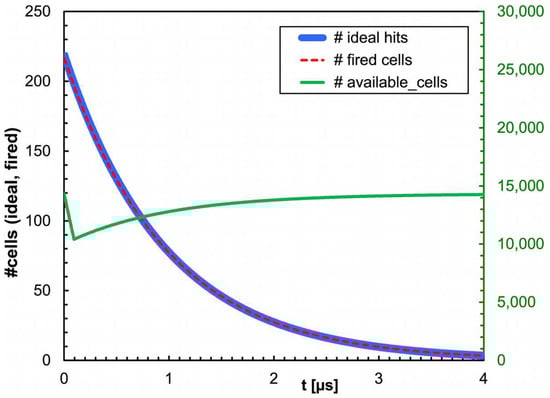 The SiPM employed for PI3SO is different from the one in refs. [,], having a smaller number of microcells (14,331 vs. 18,890) and a higher photon detection efficiency (PDE) at 550 nm (≈35% vs. ≈18%). In light of this, the time behavior of the number of active microcells during the light signal development had to be verified in order to make sure that the SiPM output signal would not undergo linearity loss due to multiple microcell hits or an excessive number of inactive microcells in recharge after being hit.