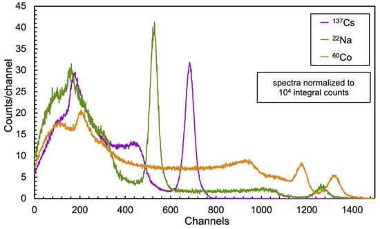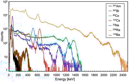 Calibrated spectra of seven different gamma sources obtained with a single detector [].