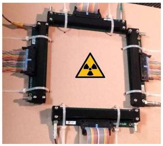 The eight boards of Figure 4b, as denoted from SN01 to SN04 and from SN05 to SN08, each one incorporating sixteen individual detectors, were loosely fixed on two cardboard sheets in a roughly square arrangement and placed one on top of the other. Figure 7 shows this arrangement, although only four boards are visible.