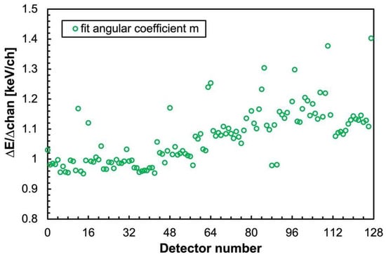 Angular coefficient m for the energy calibration fit versus the detector number.