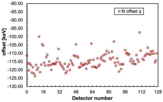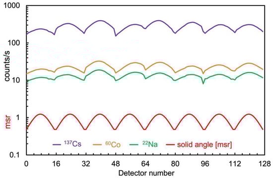 Three sample spectra, namely from detector number 120, are shown in Figure 8 and were normalized to a total integral of 10,000 in order to show them on the same vertical scale. The calibration of each detector was performed using the five peaks from Table 2 for a linear fit and proved to be fairly linear, as visible in Figure 9, where we report the correlation coefficient R2 for each detector. Figure 10 and Figure 11 show the angular coefficient m and the offset q for each detector as resulting from the fit. We remark that the values of the m coefficients for the detectors of boards 5–7 are slightly higher (Figure 10), and this is likely due to a slightly higher voltage bias, and consequently, the higher gain, for these boards. As a further cross-check of the calibration, for each detector we noted the resulting centroid energy of the Compton backscattering peak from the 511 and 662 keV gamma rays, expected at 170 and 184 keV, respectively, and reported them in a plot as a function of the detector number (Figure 12). In Figure 13, we show a 3D representation of the 128 calibrated spectra obtained with the 22Na source in the arrangement of Figure 7 in order to better visualize the goodness of the outcoming energy calibration. The same plots made with the 137Cs and 60Co sources are shown in Figure 14 and Figure 15, respectively. Looking at these plots, one can see a hint of periodic behavior, as expected from the geometric considerations regarding the different distances of individual detectors from the source placed at the center. This is clearly shown in Figure 16, where we plot the integral counting rate as a function of the detector number for the three sources, along with the solid angle subtended by each detector, assuming the perfect square arrangement of the boards.