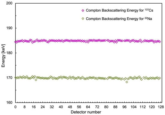 Energy calibration cross-check for the 128 detectors: the resulting centroid energy of the Compton backscattering peak for the 511 and 662 keV gamma rays, expected at 170 and 184 keV, respectively, as a function of the detector number.