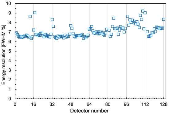 We determined the energy resolution of each detector as the full width at half maximum (FWHM) of the reference 137Cs peak at 662 keV. The values, as usual, were obtained by first fitting the peak with a Gaussian and then multiplying the resulting sigma value by 2.35. The resolution as a function of the detector number is plotted in Figure 17, where we observe a reasonable overall trend of around 7%, with a fraction of the detectors having a worse resolution, which never exceeds 9%. Remarkably, such energy resolution values, along with the full energy peak reconstruction at least up to 2000 keV, sound quite encouraging in light of the small 1 cm3 crystal size and the even smaller 6 × 6 mm2 active area of the SiPM.