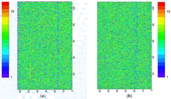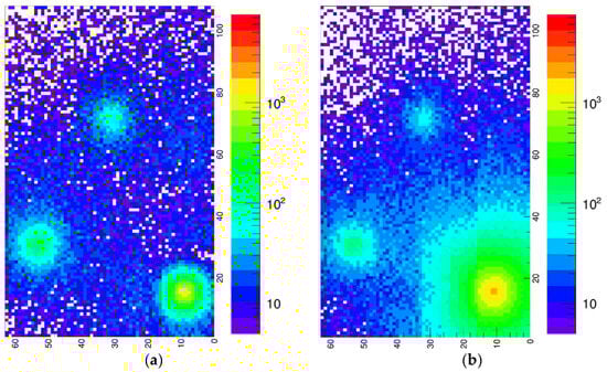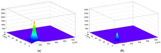 A second test was performed by placing a 1 cm thick lead plate on top of the 137Cs source, and the resulting plots are shown in Figure 21. The hot-spot in the top view is strongly reduced, even though it is still the most intense, as expected, as can be better appreciated in Figure 22, where the top view plots, with and without the lead shield, are shown in a linear scale in a 3D representation. The expected transmission through the lead plate is not easy to evaluate, as the attenuation coefficients provided by NIST [] are provided for an ideal pencil beam, whereas in our case the radiation comes from a close point-like source. Nonetheless, from the data collected in the 1 × 1 cm2 pixel reporting the maximum number of counts, we calculated the transmission of the 137Cs gamma rays with three different approaches and compared the results with the value deduced using the NIST mass–energy absorption coefficient []. In the first approach, we simply calculated the ratio between the integrals of the two spectra. Then, we calculated the same ratio but limiting the integral to the 662 keV peak area. The third approach was to calculate the total deposited energy by summing the energy bin by bin, weighted with the number of counts in the bin. The results, listed in Table 4, show measured values that are basically self-consistent, while there is a difference with respect to the NIST value, which is likely due to the difference between the real and ideal geometry. Indeed, a fraction of the radiation ideally destined for the pixel is scattered away while crossing the lead plate and thus is not recorded in the pixel itself, lowering the measured transmission value.