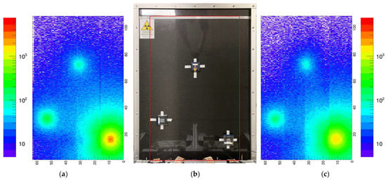 (a) Result of the gamma scan with the three sources, top view. (b) The three sources placed on the table. (c) Result of the gamma scan with the three sources, bottom view.