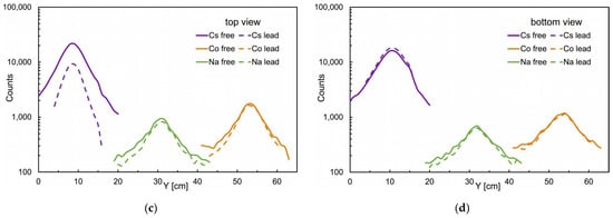 Plots of 1 cm wide slices cut on the maximum of each hot-spot for the two scans with and without the lead plate on the 137Cs source. (a) In the X direction, top view. (b) In the X direction, bottom view. (c) In the Y direction, top view. (d) In the Y direction, bottom view.
