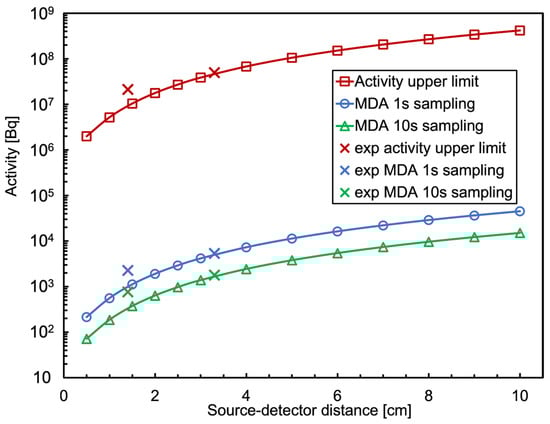 Another limitation of the system could be the limited high-rate capability. Indeed, the 20 µs integration time we employed can be reduced to 5 µs with little influence on the energy resolution, thus implying an upper limit in the order of 100,000 counts/s. By means of the previous calculation, we were able to translate this limit into an ideal activity upper limit as a function of the distance and we plotted it in Figure 26 as well. The same considerations regarding the reduced interaction efficiency at a short distance produce here a benefit, because it raises the activity limit at a short distance to a few 107 Bq.