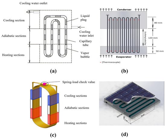 Types of PHPs. (a) Closed-loop pulsating heat pipes (CLPHPs) []; (b) open pulsating heat pipes (OPHPs) []; (c) pulsating heat pipe with check valve []; (d) flat-plate closed pulsating heat pipes (FPCPHPs) [].