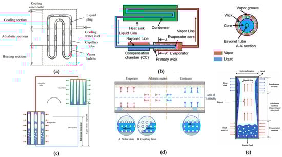 Structure of different types of heat pipes. (a) Closed-loop pulsating heat pipes (CLPHPs) []; (b) loop heat pipes (LHPs) []; (c) separate heat pipes (SHPs) []; (d,e) gravity heat pipes (GHPs) [,].