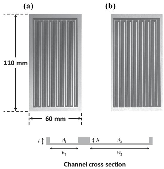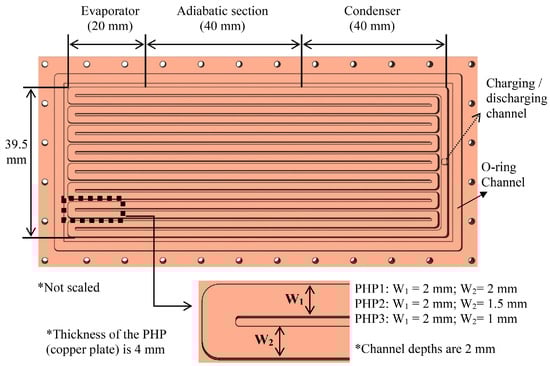 Markal et al. [] designed plate pulsating heat pipes with channel widths of 2–2 mm, 2–1.5 mm, and 2–1 mm, all having a height of 2 mm, as shown in Figure 4. They observed that in the horizontal orientation, the thermal resistance of the uniform heat pipes remained almost unchanged, whereas the thermal resistance of the two non-uniform heat pipes decreased, indicating better heat transfer performance. This suggests that the non-uniform design can mitigate the influence of gravity. Additionally, reducing the channel diameter increases the evaporative momentum force, which is a crucial factor in enhancing the performance of non-uniform PHPs. In a separate study [], a PHP with a gradually tapered structure was developed, which promotes fluid circulation and remains less sensitive to variations in inclination angle. This feature is particularly advantageous for ensuring the stable operation of PHPs across different angles of inclination.