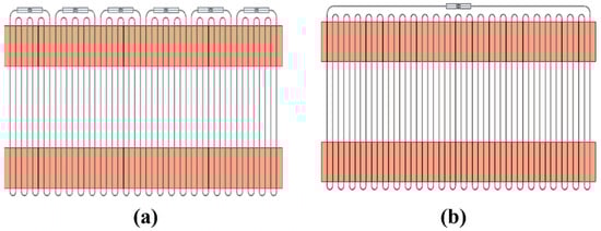 The number of turns is an important geometric parameter of pulsating heat pipes. It is believed that PHPs are more feasible to start up with lower heat input. Sun et al. [] studied the effect of the number of turns on PHPs by testing two hydrogen closed-loop PHPs with two turns and five turns under different liquid filling ratios and heat flows. They indicated that the effective thermal conductivity of the two-turn PHPs is higher than the five-turn PHPs at each filling ratio. But the thermal resistance of the two-turn PHPs is larger than that of the five-turn PHPs due to the smaller heat transfer area. If the two-turn PHPs are scaled up by 2.5 times to a total of five turns, they will outperform original five-turn PHPs in terms of thermal resistance and effective conductivity. Lyu et al. [] conducted a similar experiment, comparing serial–parallel 24-turn helium PHPs with 4-turn helium PHPs and serial 24-turn helium PHPs. The results showed that the 24-turn series–parallel helium PHP exhibits the smallest temperature gradient and the smallest thermal resistance. Secondly, the main advantage of the serial–parallel 24-turn helium PHPs is able to transfer very high heat loads under cryogenic operating conditions. Li et al. [] compared the effect of 8 turns and 48 turns on the heat transfer performance of helium-pulsating heat pipes. They found that increasing the number of turns from 8 to 48 enhances the heat transfer capacity of the PHPs, but the maximum effective thermal conductivity decreases. However, they defined the 48-turn configuration (as shown in Figure 5) and found that the heat transfer capacity and effective thermal conductivity are better in a vertical parallel configuration than in a series configuration.