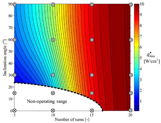 - Lee, J.; Joo, Y.; Kim, S.J. Effects of the Number of Turns and the Inclination Angle on the Operating Limit of Micro Pulsating Heat Pipes. Int. J. Heat Mass Transf. 2018, 124, 1172–1180. [Google Scholar] [CrossRef]