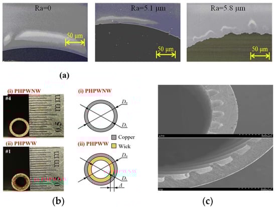 Ishida et al. [] compared the influence of 1 mm circular tube internal roughness on pulsating heat pipes, as shown in Figure 7a. They found that the effective thermal conductivity values of rough circular tubes are larger than those of smooth circular tubes. They considered that roughness enhances wettability and expands liquid film widely on the inner surface. As a result, thermal performance was enhanced. Wu et al. [] compared the effects of a sintered core versus an unsintered core on PHPs, as shown in Figure 7b. They found that the addition of a sintered powder core improved nucleation boiling in the evaporator, thereby enhancing the thermal driving force, and provided additional capillary action to facilitate liquid backflow into the evaporator. Qu et al. [] proposed a micro-slot structure for PHPs, as shown in Figure 7c. This modification led to a reduction in the required starting power for the pulsating heat pipes when oriented vertically.