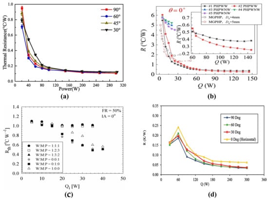 (a) Thermal resistance of 3D-PHPs versus heating power with different filling ratios []; (b) thermal resistance of PHPs at 0° []; (c) thermal resistance of ternary mixture in horizontal direction []; (d) the relationship between the thermal resistance 3D-PHPs and input power under different inclination magnetic fields [].