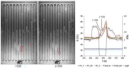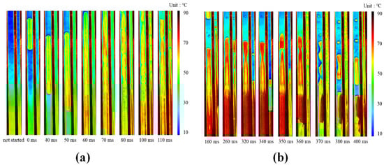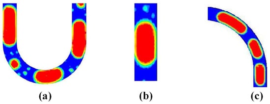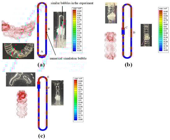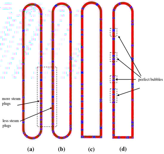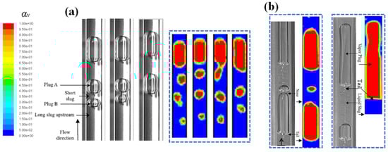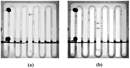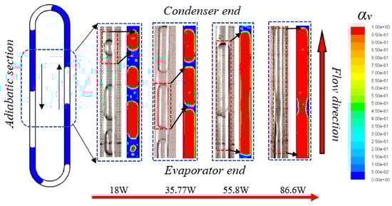 Qu et al. [] visualized micro-pulsating heat pipes (MPHPs) with varying hydraulic diameters (251 μm, 352 μm, 394 μm) and revealed distinct flow patterns for each size. During the visualization process, they found an intriguing “injection flow” phenomenon in the condenser of 394 μm MPHPs, a previously unreported occurrence, as shown in Figure 3.