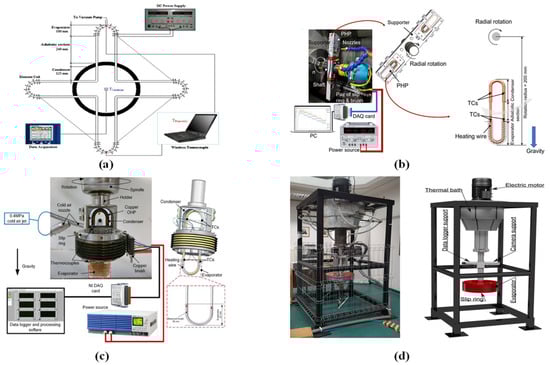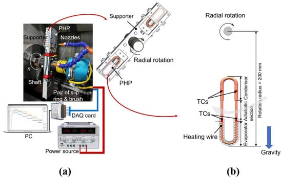 (a) Radial-rotating PHP experimental apparatus; (b) illustration of radial-rotating PHP [].